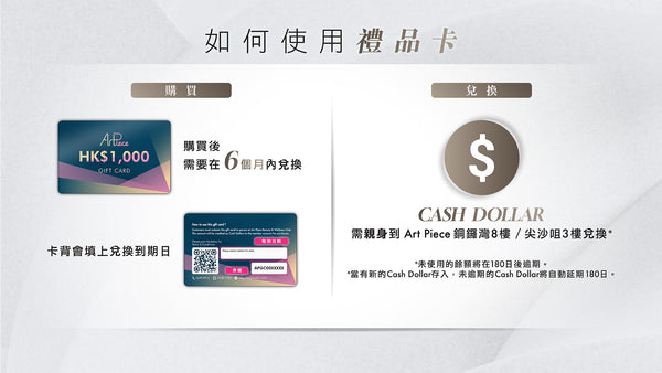 - 顧客需親自到 Art Piece 美容及休閒生活館兌換禮品卡,其金額將以Cash Dollar形式存至會員帳號以進行消費。