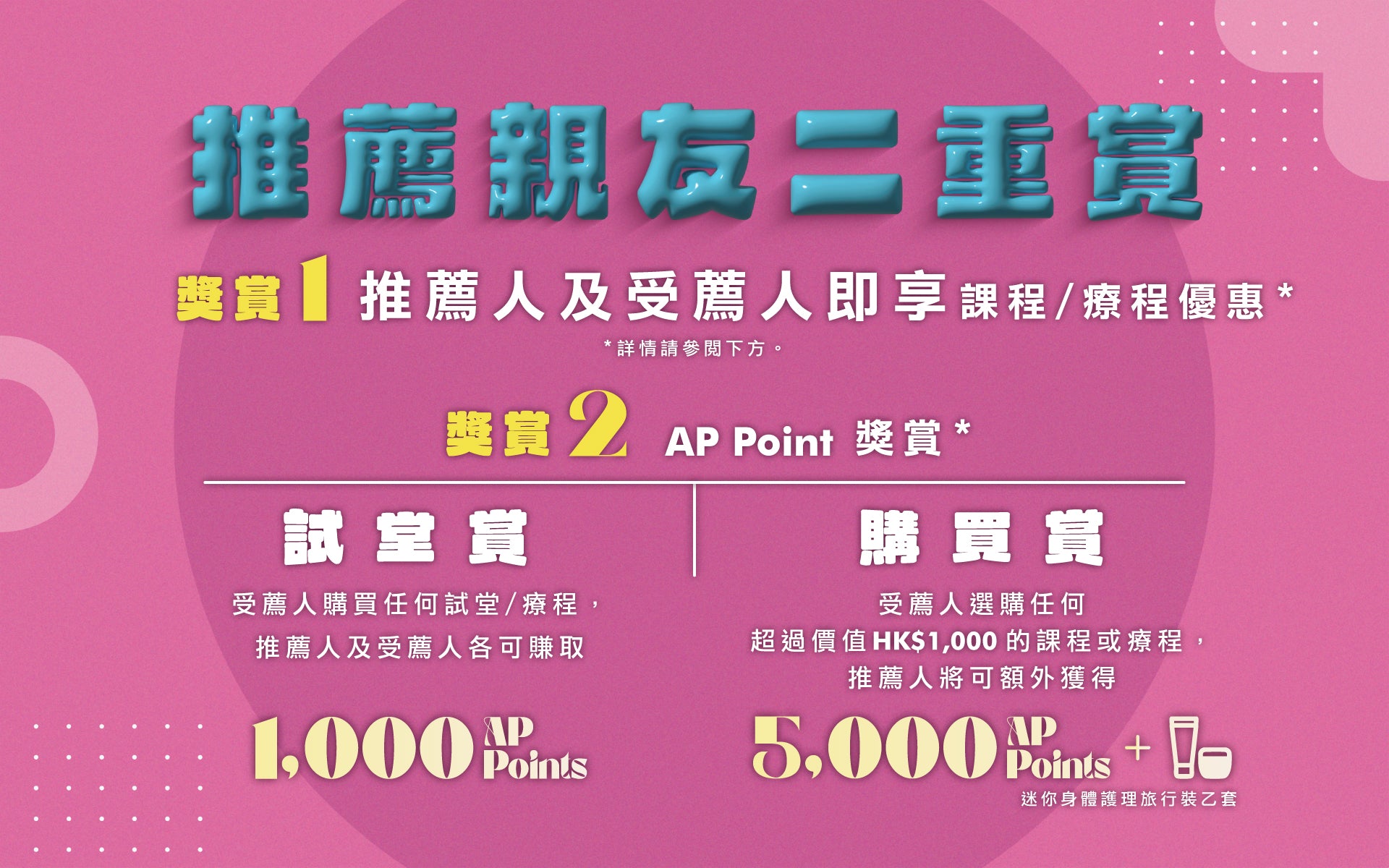 推薦人 : 成功推薦新客戶購買療程到指定的消費金額,即可獲得免費指定療程